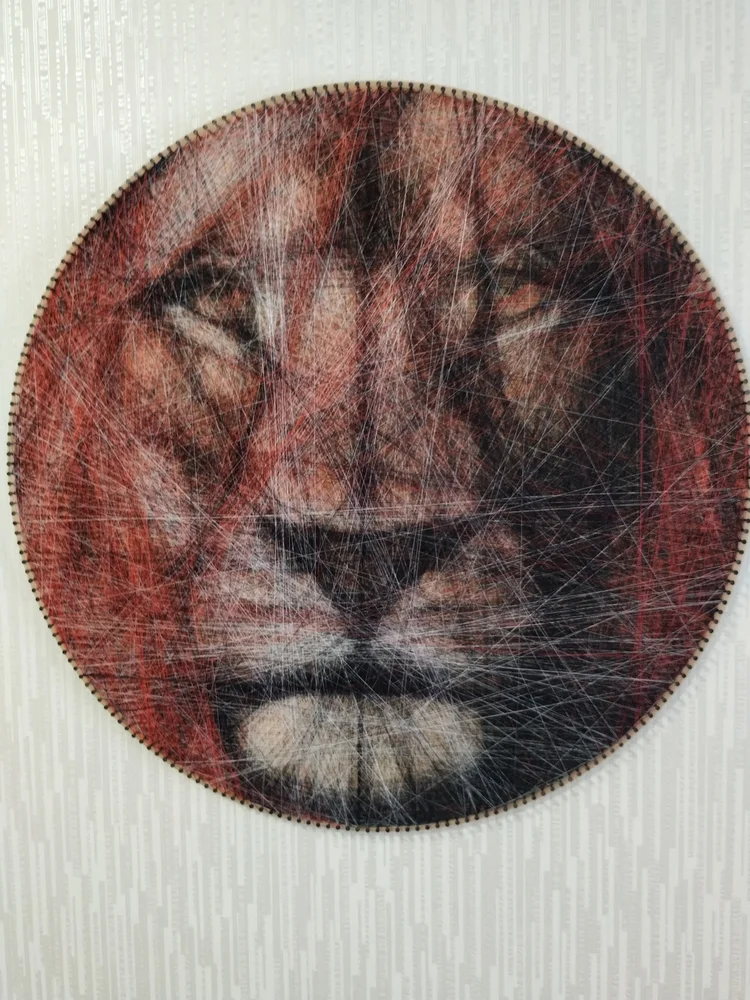 The effect is remarkable. Black, white, yellow, red, and green threads, crisscrossing over one another and winding around nails hammered around the edge of a circular plywood board, somehow come together to form a realistic portrait. Each piece takes hours to make, the string passing cross the piece as many as 8,000 times in order to create the final image.