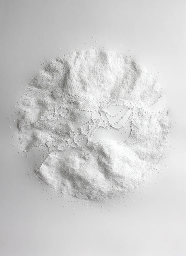 Her artistic universe is largely inspired by nature, its abyssal dimension as well as its vegetal or mineral forms. Her sculpted artworks are a confrontation of smooth and grainy texture on the same linear paper. A cloud of small perforations, incisions, and punches which play on the elasticity of the paper, to create a topographic relief. A controlled wandering of dotted lines, scales and bumps are drawn following the movement of her hand on the paper. The flow is both free and thoughtfully planned, allowing unexpected movements and completely abandoning set patterns at times.