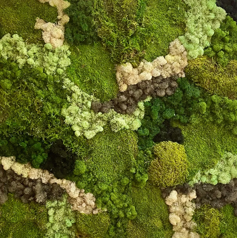 Her abstract moss assemblages are textural green sceneries that resemble aerial landscape views that invite the viewer to escape today’s chaotic digital life and reconnect with natural beauty.