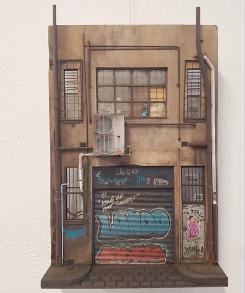 Cardboard, MDF, Plastic Card, LED Lighting, Balsa Wood, Aliminum tubing, Wire, Recycled Card,Adhesive paper, Spraypaint
